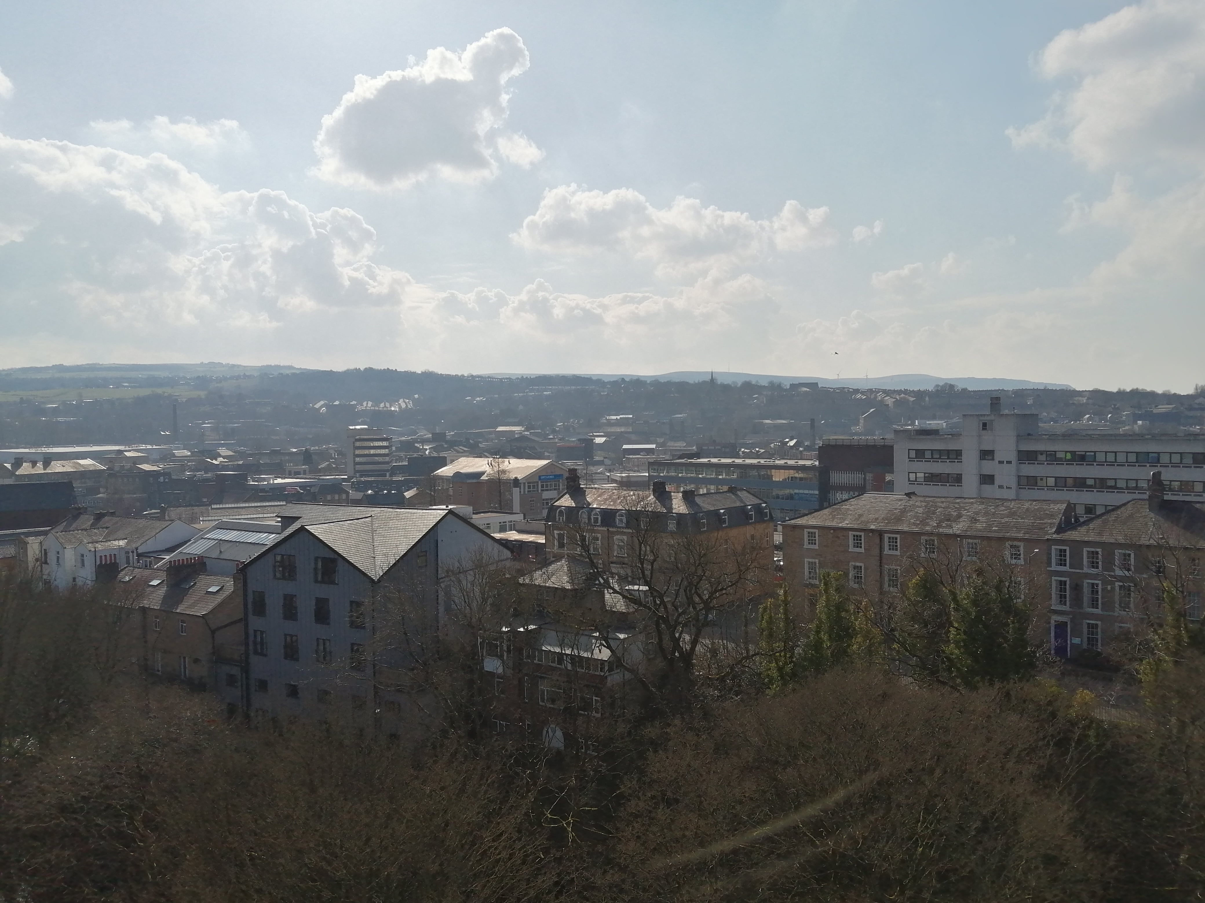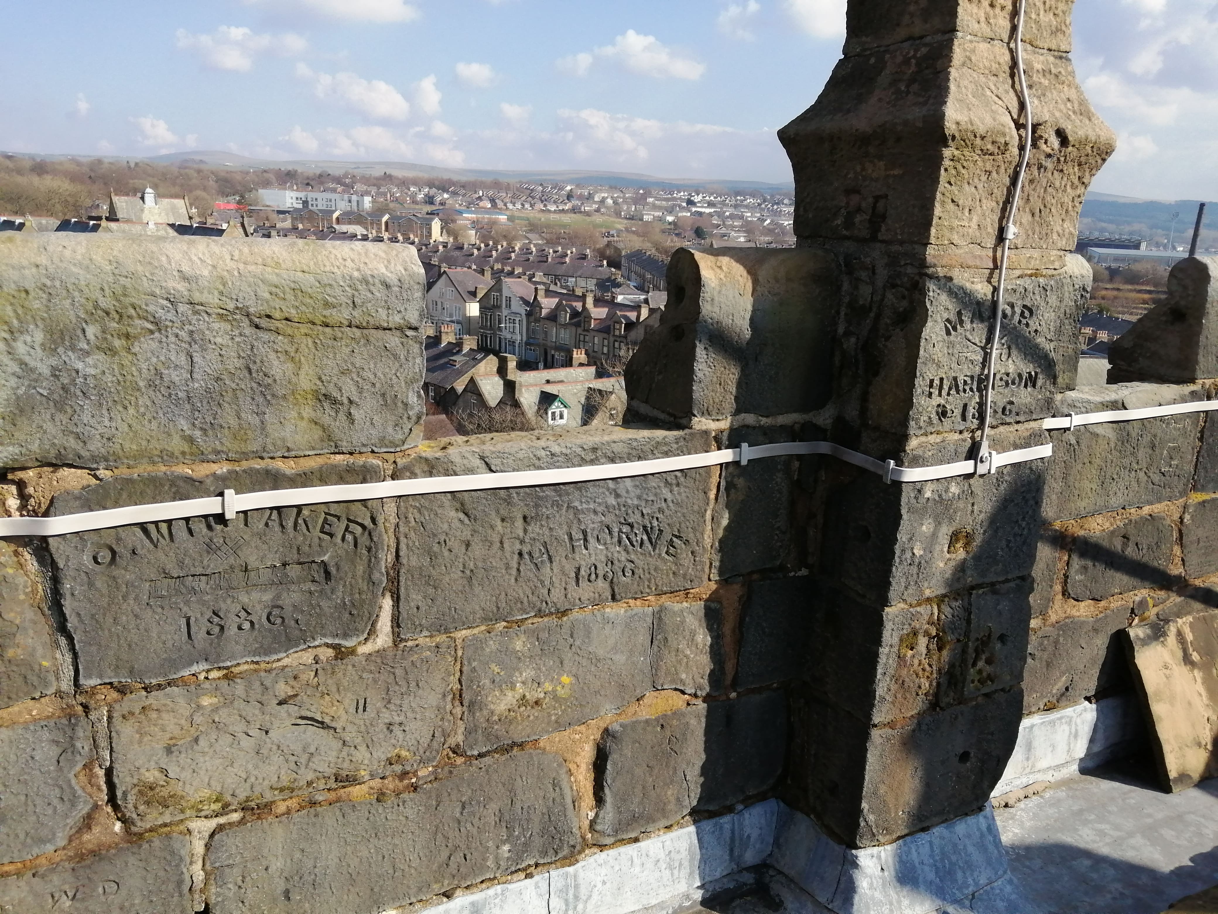 As you wander round, hidden away in the tower at church… a narrow, dark spiral staircase, various rooms with memorials, a narrow ladder to maintain the clock, a dark belfry… but climb to the top on a nice day and enjoy some lovely views of Burnley.
